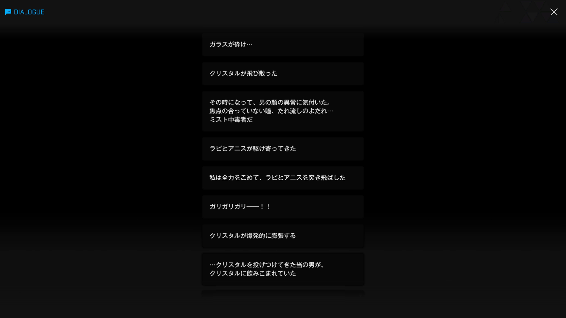しかし、さすがに上記1 & 3枚目の内容は首を傾げざるを得ない → そもそも、主人公達のいた場所は『エニックがクリスタル拡大阻止の対策を事前にしていない』&『地下などにどのような電気配線があるかすら不明』である(しかも、ミスト中毒者は即死しているにもかかわらず、せいぜい10m程度離れた距離に『都合よく』安全地帯があり、『偶然3名ともそこに移動していた』が、なぜか『ニケが2名いるにもかかわらず、クリルタルが襲ってこない』という不思議な状況)
