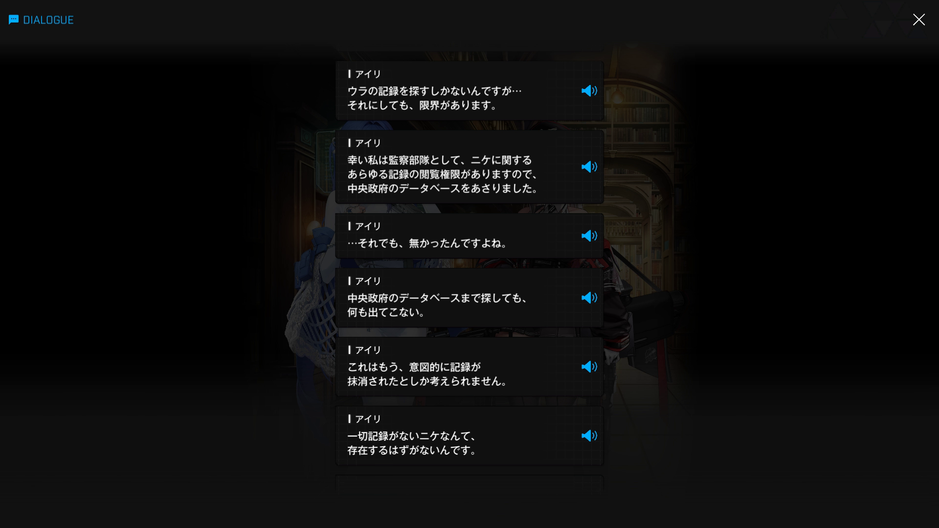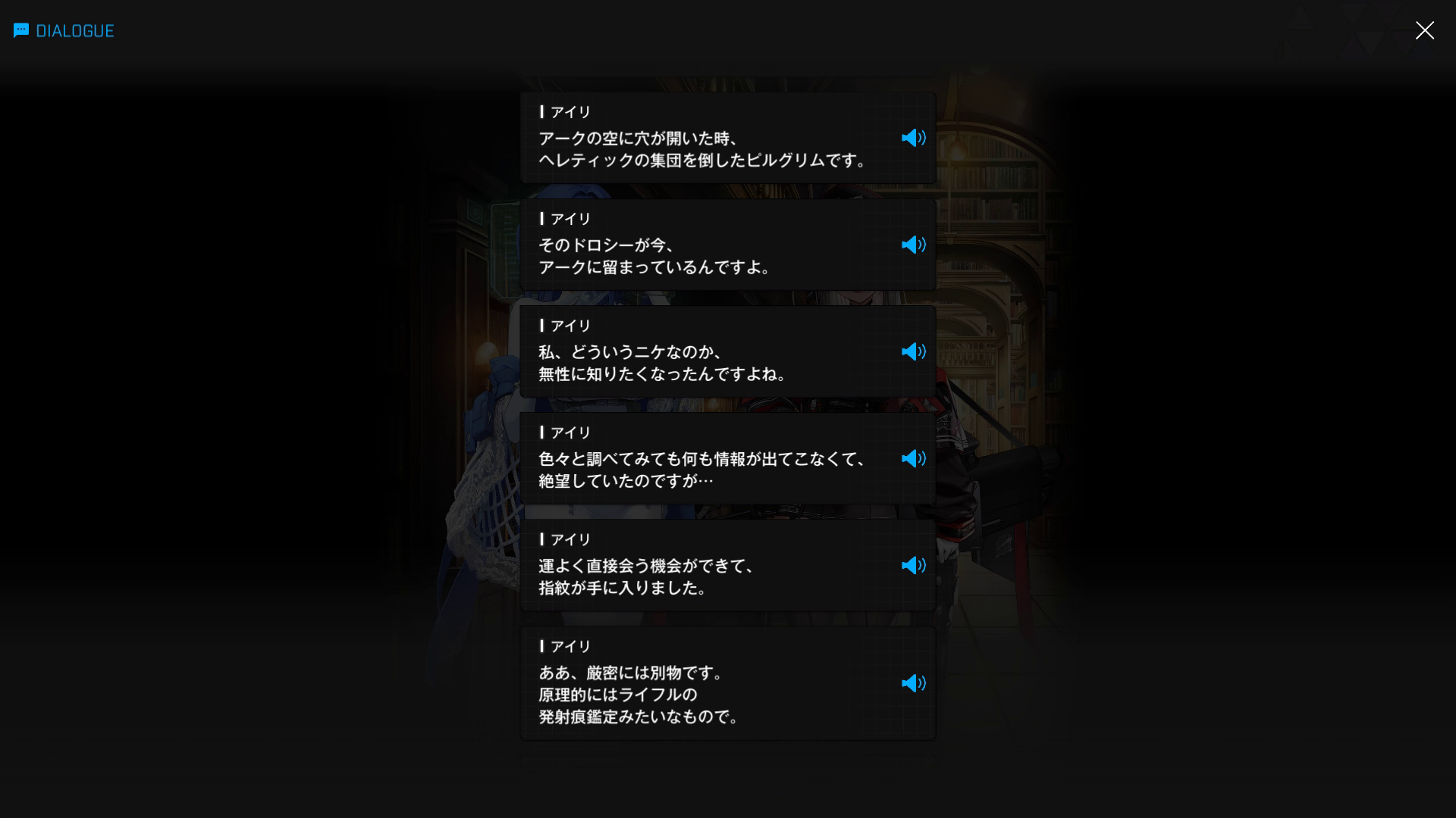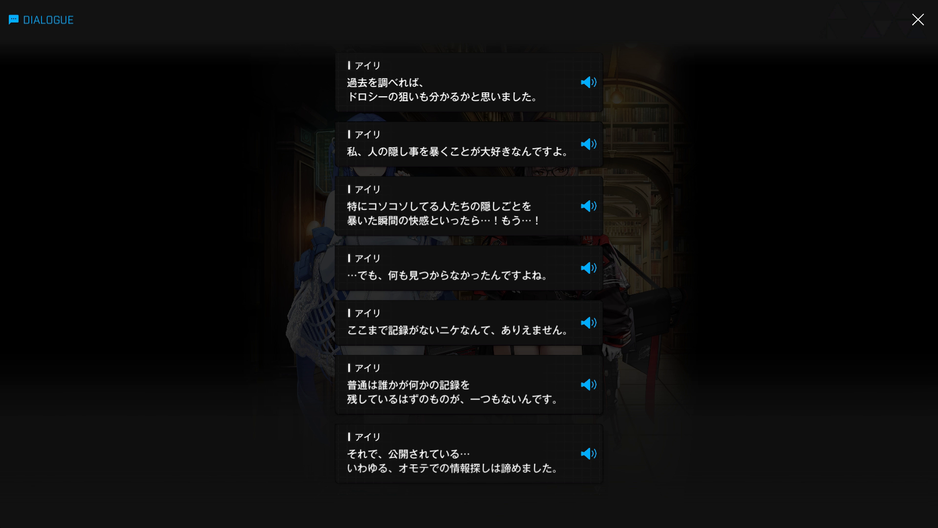 ・アイリが開始した『ドロシーの秘密暴いちゃうゾ♡』作戦だが、あのむちむち眼鏡はいまだに諦めていないらしい → こちら & それ以降の捜査内容を、必死でアルカナに説明する(⋯⋯しかし、いくら監察部隊所属であろうとも、ジャッジスの許可が下りていないため、禁書庫に入った瞬間、シージペリラスに即処分されると思うのだが⋯⋯?)