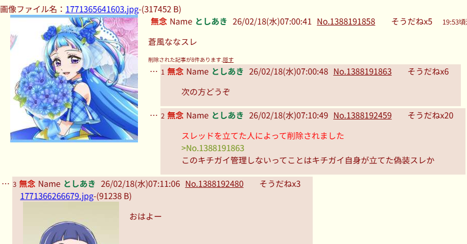 sage爺の無意味かつ無価値な常同行動の一つ。なりきり精度も低い。 プリキュアスレとして元の住人が立てていた時代に出没していた「健全のどか」というクソコテと同一人物。 登場キャラへのリョナ画像も連投しており作品やキャラへの愛といったものは客観的に見て皆無と言える。 自分で汚物画像連投を行い、他人にその所業を擦り付けるといった行動も。 2026年の早々から「なー」を食らう管理人さんも認めるクソスレ。 一例:26/01/17_ 昼のどか_スレ豚健全sage爺リョナ画像連投
