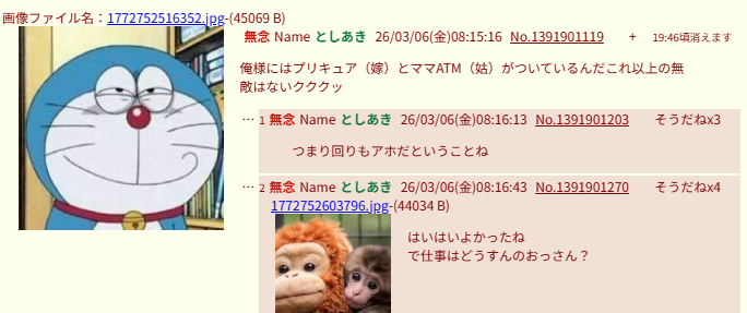 Mayでのドラえもんのイメージを大きく毀損しているクソ中のクソスレ。キャプ画や二次創作の変なドラえもん画像+たわ言そのもののスレ文。2025年11月には25/11/03(月)_俺のスレのボー妨害者に告ぐ_荒らし先自白スレ といったスレで馬脚を現した。この爺の真似をするメリットは他者には一切無いのでおそらく本人。