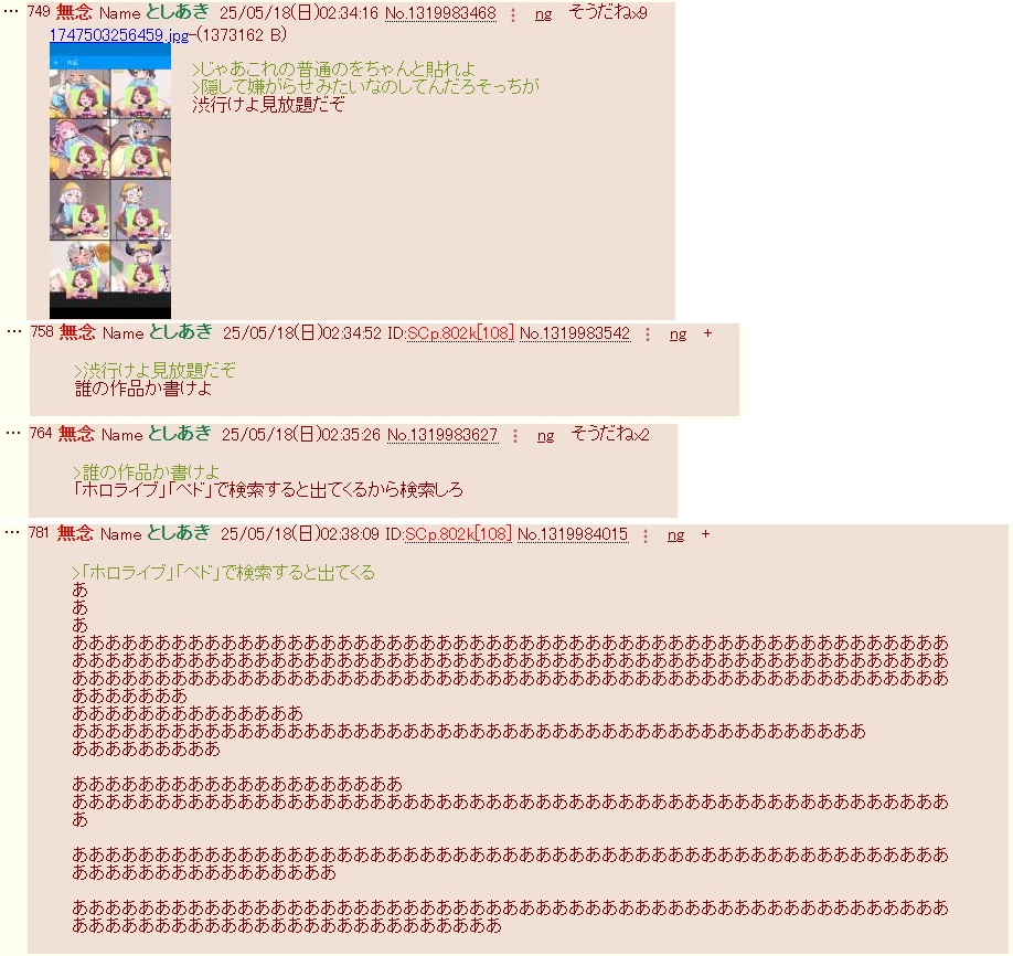 ※2024年12月には『プ◯パラ』キャラの真中のんの二次創作エロ画像の高解像度版を求めて、なぜか「淫夢スレ」に侵入。画像を要求し「探せ探せ」といった連投を行ったほか、他項で述べた画像連投行為を行った挙げ句の果てに、ハロワなどの就職サイトのリンクを踏まされるネットリテラシーの欠片もない醜態を晒した。