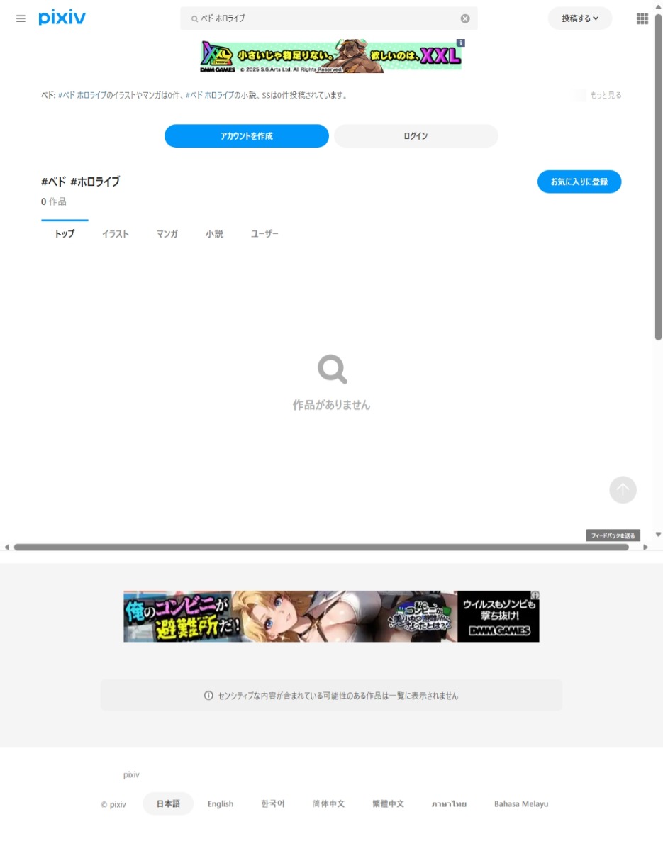 【画像:ログインしていない状況でのPixivの画面。sage爺はこのように見えて発狂したのであろう。】