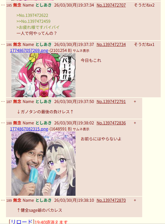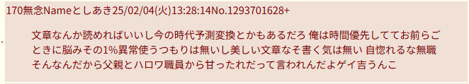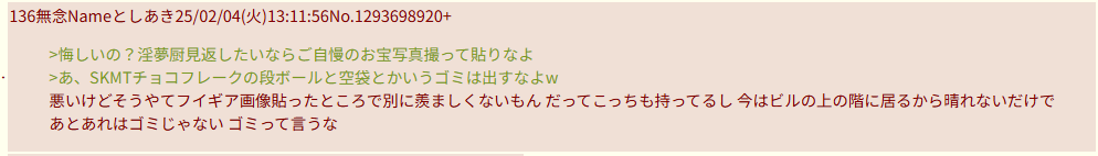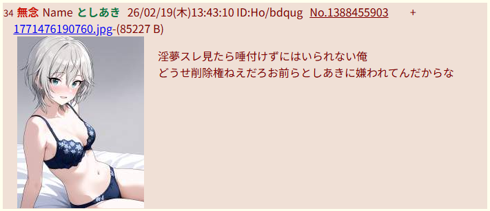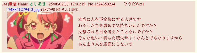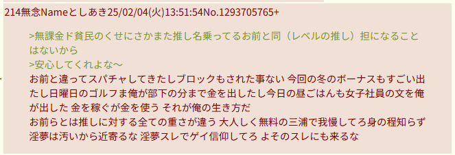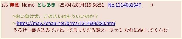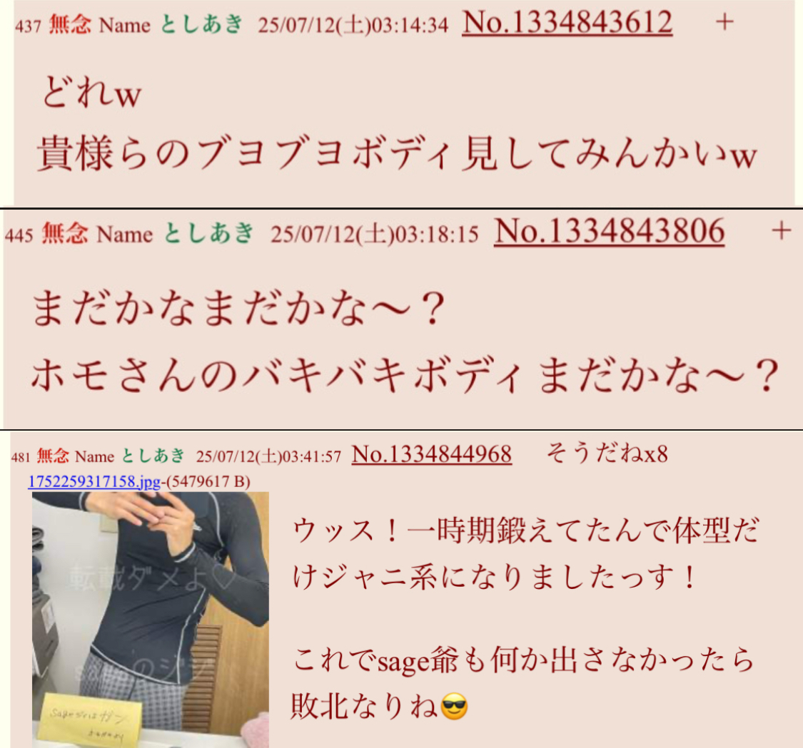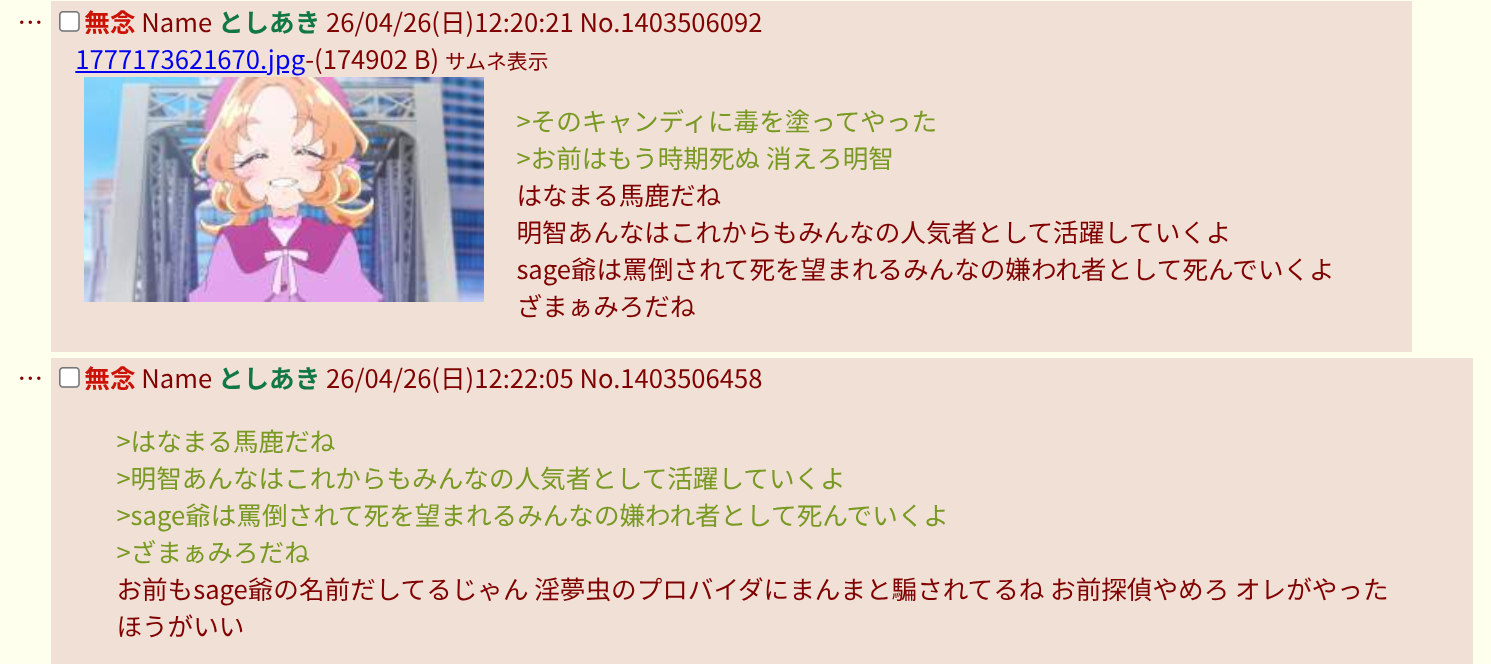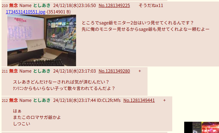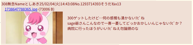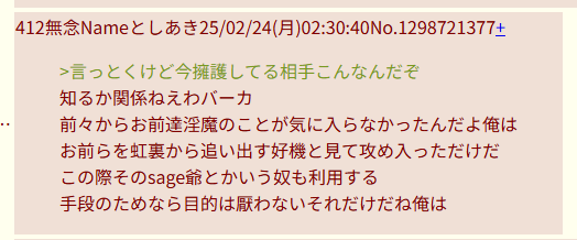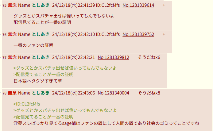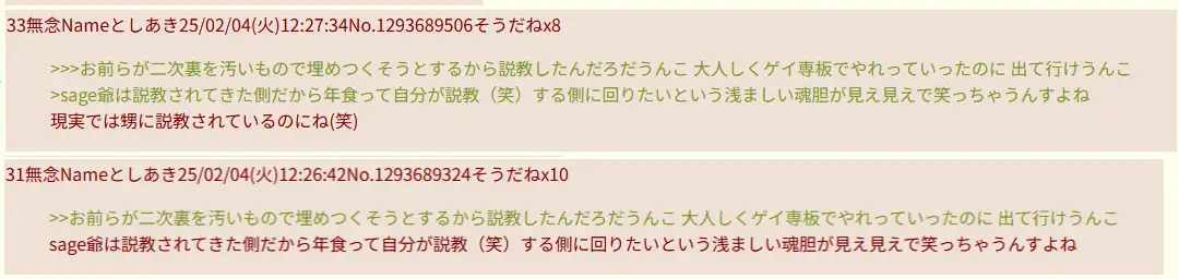 sage爺産「姪」(いつもの妄想)スレの終盤現れた推定女子あきへの精スプ反応。必死過ぎて草。