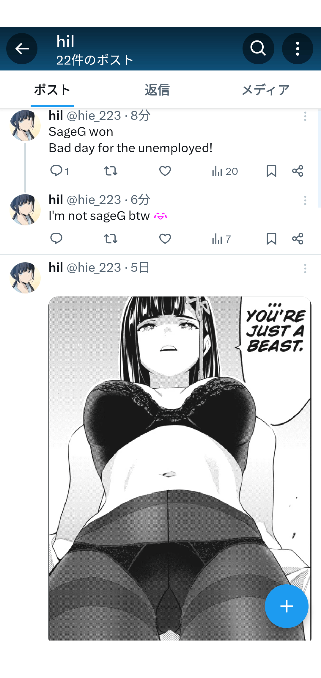 sage爺が取得していたX(Twitter)のアカウント内での発言。周囲からのあだ名がついに自認と一致したようである。こんななんの喧伝にもならないようなアカウントで工作(笑)をやる意味もないので思わず本音が漏れたというやつであろう。 |