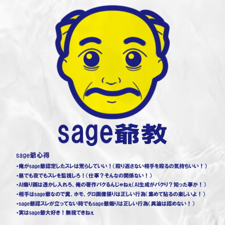 sage爺本人のみが存在を主張する謎の宗教。sage爺をしばくとしあき達を新興宗教の信者に見立てて嘲笑する意図だろうと思われるが、その中でも自分をトップに据えたいというチンケなプライドがありありと見える見える…。