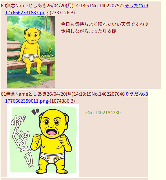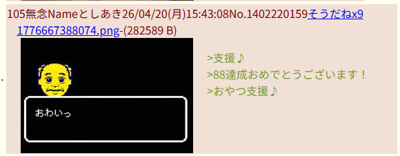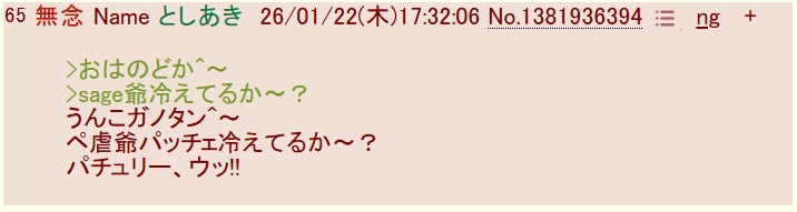 sage爺が「のどかスレ」内で支援と称する一連の意味不明な書き込みの一つ。このレス内容で何故おやつの「代わり」になるのか、「代わり」としてどうするのか、健常者には意味が掴みかねる。