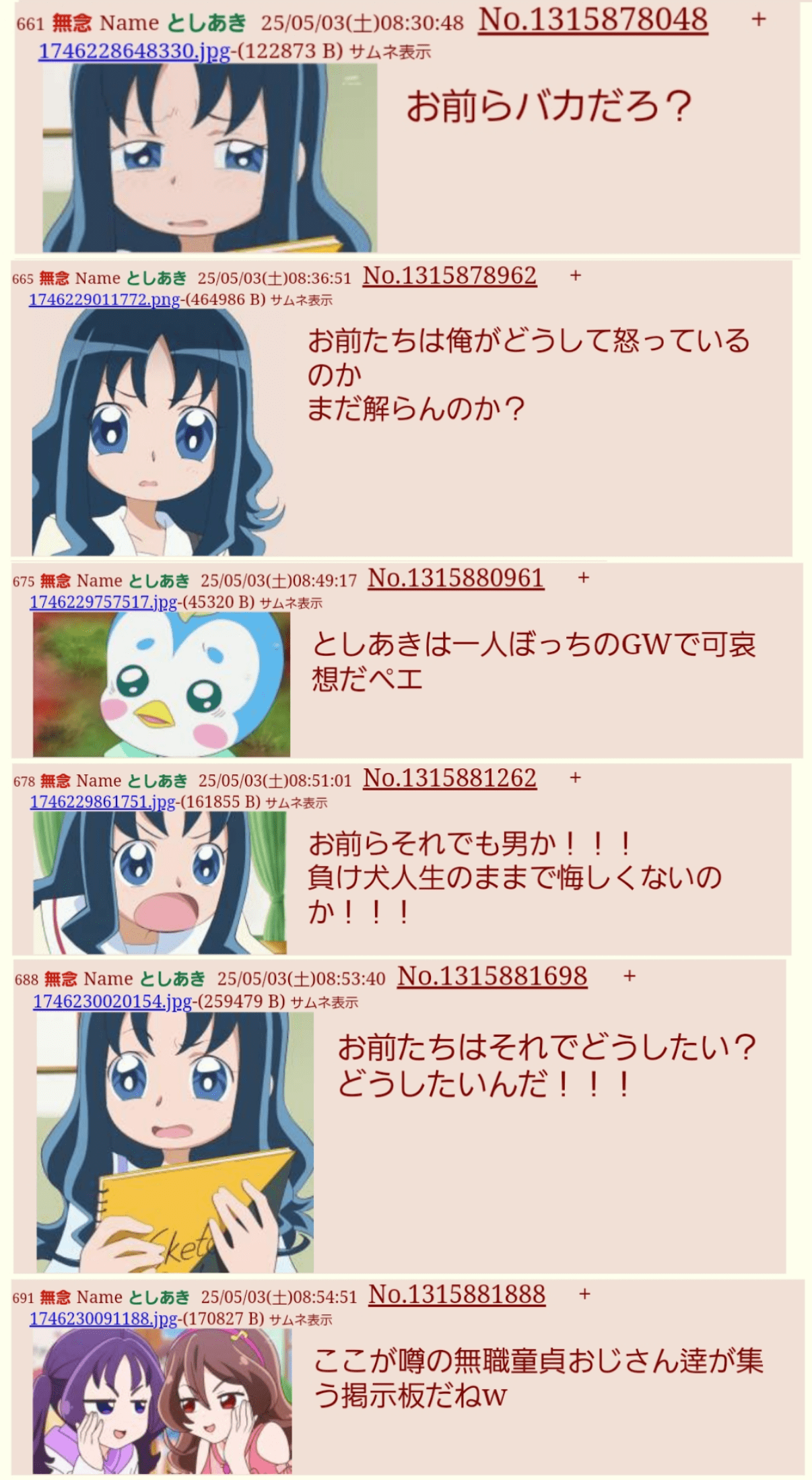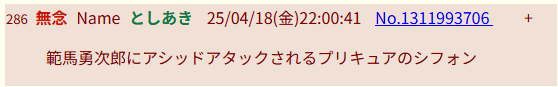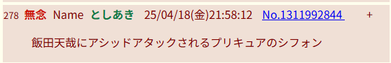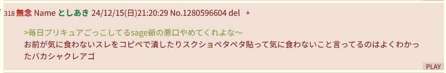 上述wiki潰しモード中、sage爺が漏らしたレス。意気揚々と吠えるプリキュアごっこの最中であったため、単に文字で表すには難しい面白さが感じられる。