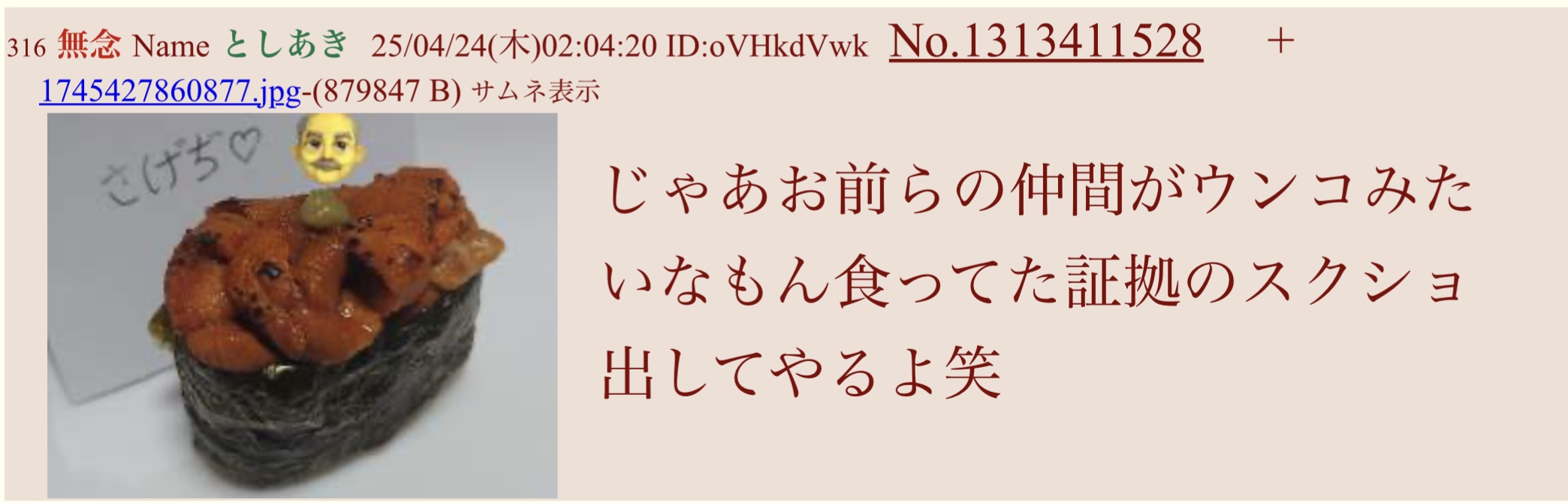 sage爺にはウニの軍艦巻がウンコに見えているようである。日頃高級寿司がどうこうと騒いでいるが、実際の知識や体験はこの程度でお察し。