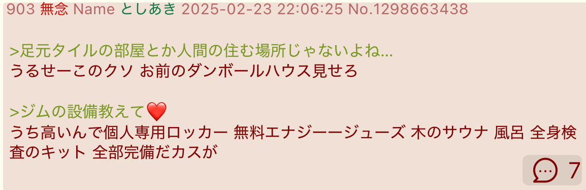 sage爺が投稿した煽りレス。sage爺の住環境が反映されていると思われる。sage爺座敷牢入牢説と合わせて考えると信憑性が増してくる。