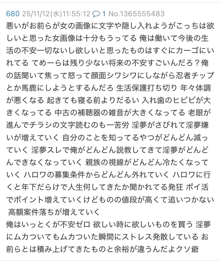 | 部屋の中汚物だらけ | へやのなか | 絵空事とは思えない真に迫ったsage爺の発言。 |