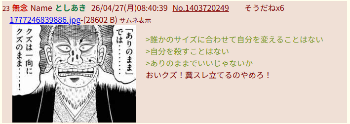 突如同情を乞うような発言をし始めた中のいちフレーズ。こんな辛い境遇であるとアピールしたいようだが、仮にそうであったとしても斟酌する理由はとしあき達には無い(断言)。sage爺の日頃の言動を見れば爪弾きにされるのも当然の帰結。