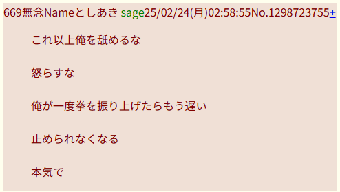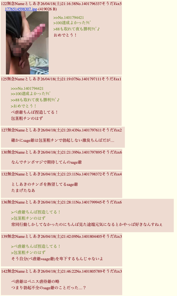 sage爺の虚勢。何がなんでも自分を大きく見せたいというのも哀れだが、荒らしの健全sage爺に味方する人間などいようはずもないし自業自得である。虚言癖の症状かもしれない。