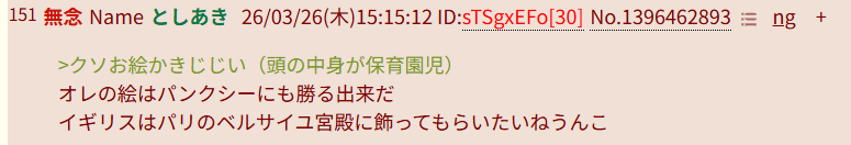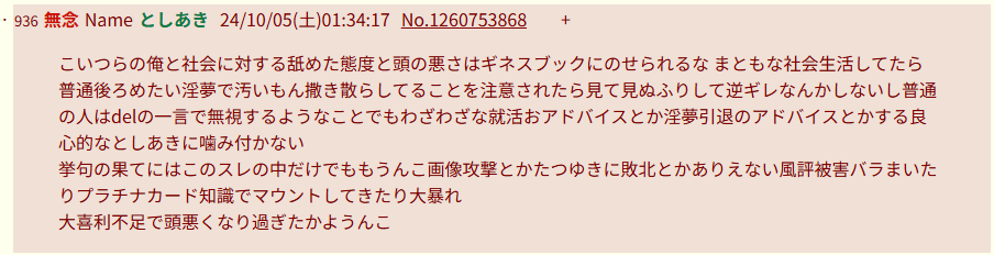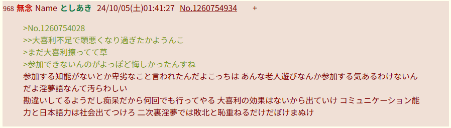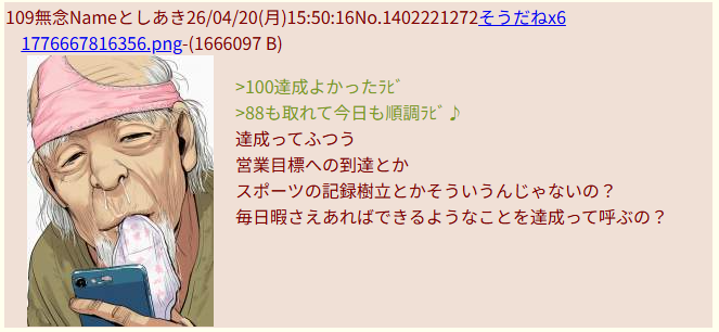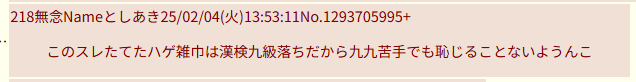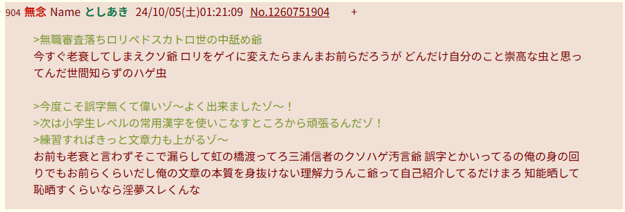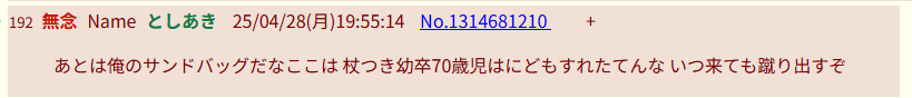 推測されているsage爺の属性と妙に重なる部分が多いsage爺の汚言の一つ。sage爺の自身の属性の「小学校卒業」「年齢60代」よりもハードルを下げて罵倒に用いているのだろう。こんなことでしか自尊心を回復させられない老人惨め。