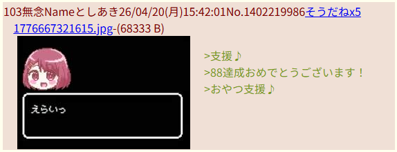 sage爺が執着するキリ番(笑)の一つ。この番号に書き込めばsage爺の中では「勝利」を得たことになるようだ。どうでもよい数字に固執するあたりなんらかの障害が疑われる。