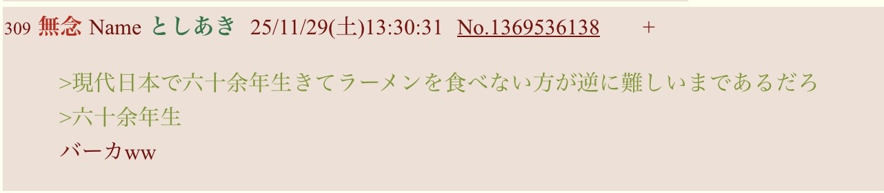 主語述語がおかしいsage爺の発言。あるいはラーメンというものを口にしたことがないのかもしれない。