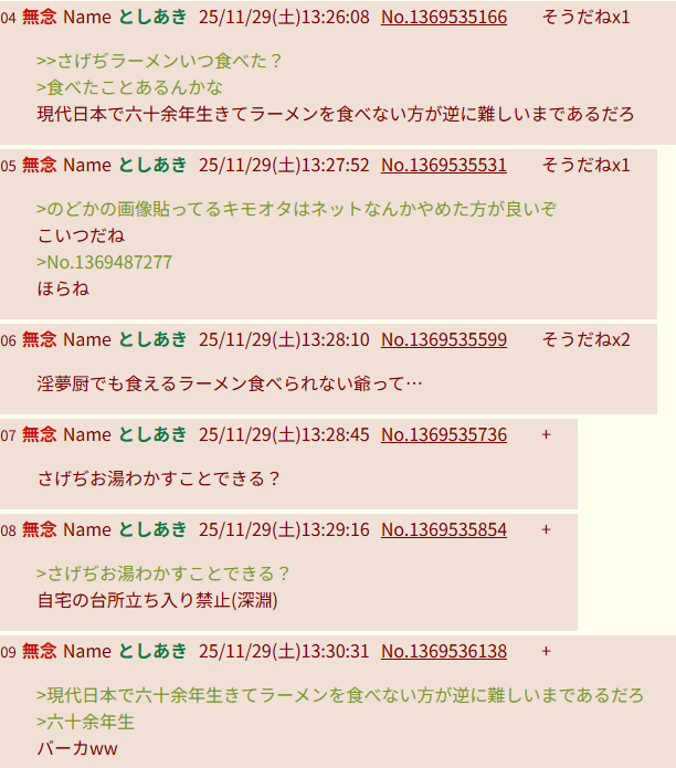 主語述語がおかしいsage爺の発言。固体と液体の区別がついていないようだ。物質の三態は小学校三年生程度で履修する内容。sage爺小学校脱走説の傍証かもしれない。 あるいはラーメンというものを口にしたことがないのかもしれない。