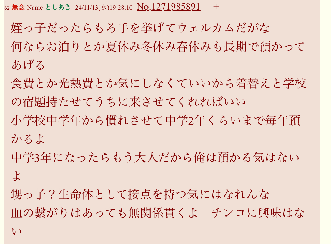 | 姪っ子だったらもろ手を挙げてウェルカムだがな |