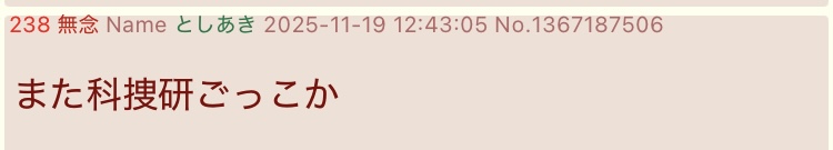 | 淫夢虫の標本作ってる | いんむちゅ | 2025年3月11日の発言。繰り返しコピペ連投したフレーズだが、例によって大した意味はない。標本が作られてるのはお前じゃい。 |