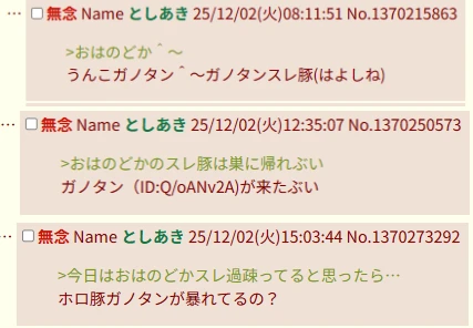 のどかスレを乗っ取った自称・「健全のどか」ことおはのどかスレあきのsage爺はここへ謂れのない恨みを向けていたようだ(※1)。理由は様々に考えられるが有力なものは、sage爺が自身の自認やアバターに使うペギタンを虐待するスレであったから敵視していたのが有力説である。( sage爺のアバター参照)