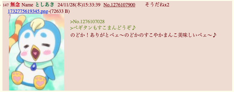 【画像:AI二次創作ペギタン。虐待以外の二次創作物は虹裏では珍しいかもしれない。】