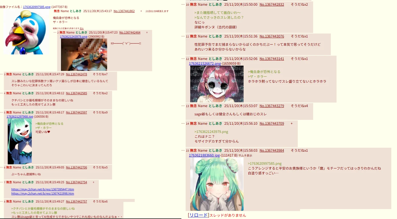 2025年3月にはボコボコにされ、頭沸騰したsage爺こと健全のどかはキュアグレースのR18G画像を投稿。大いに顰蹙を買いながらも「のどかスレ」で見苦しい言い訳に終始する無様が観測された。こいつはメチャ許さんよなあぁ?(別語録)