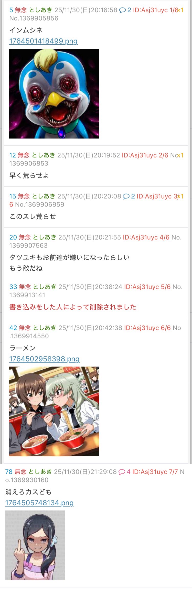【画像:威嚇(?)のための盗用、タツユキへの執着やラーメンへの欲求、Del蓄積の結果のID露出など無様ポイントは多い。】