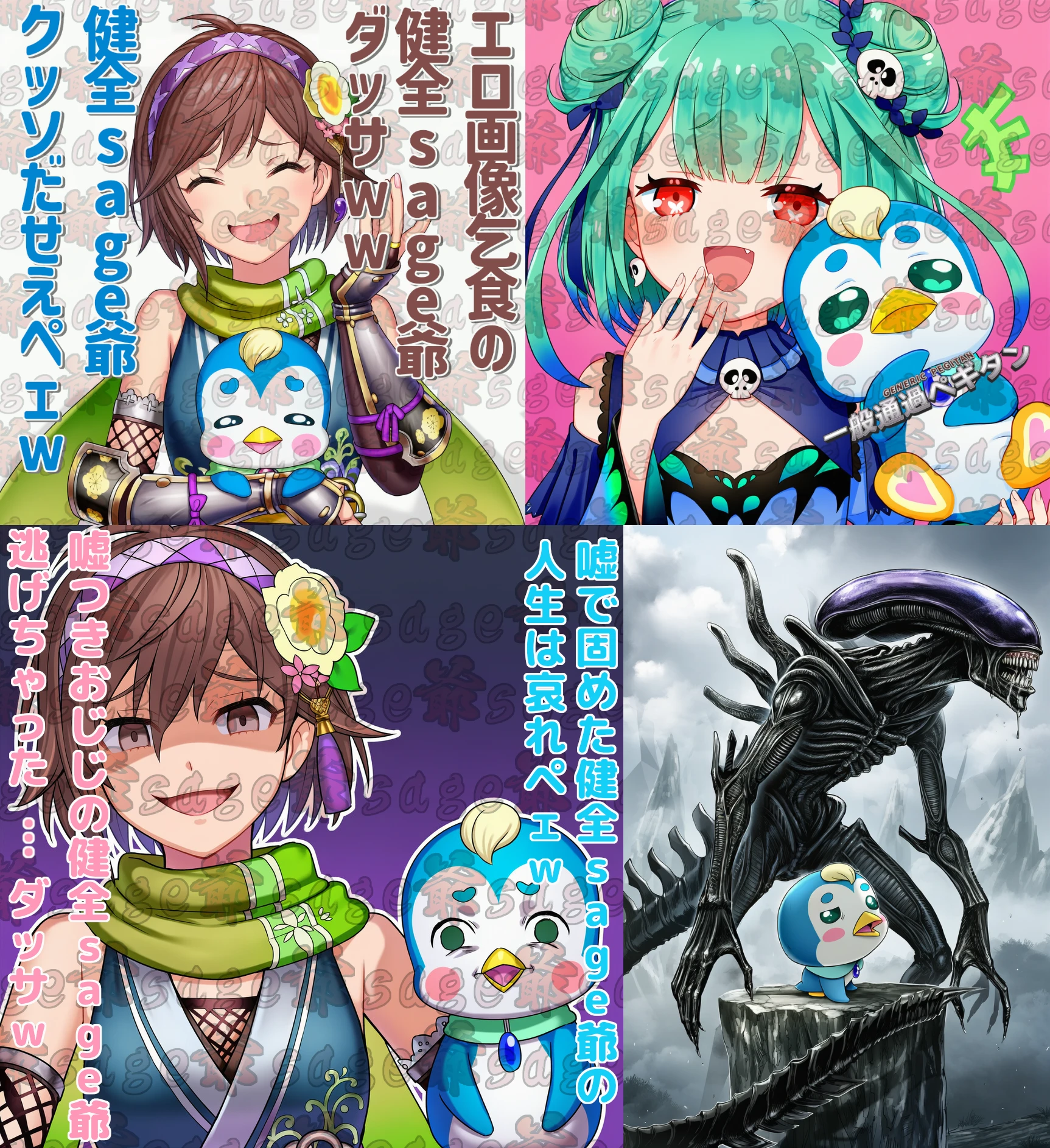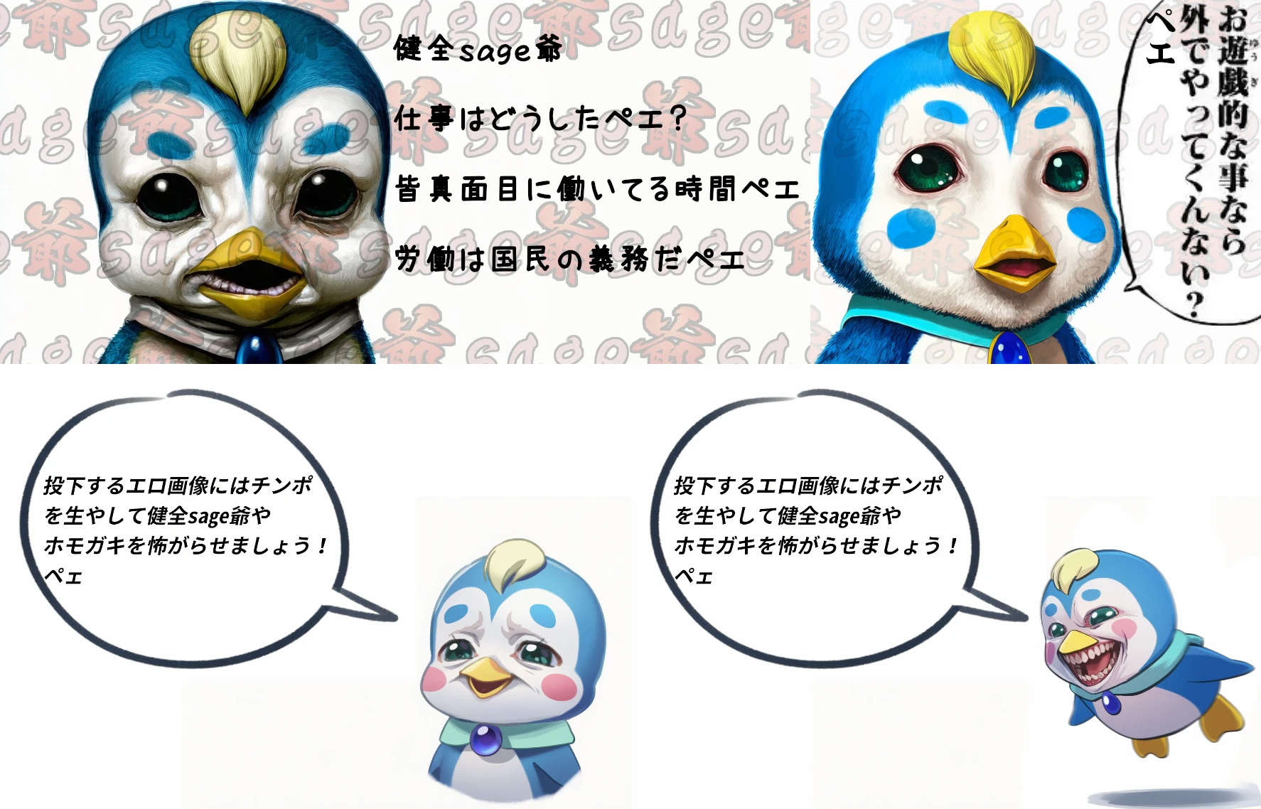 2025年10月頃からちょくちょくsage爺の出没先であるスレに投下されていた。これ以前にも煽り用として生成されたもの、sage爺が執着するキャラとの組み合わせで煽る目的のものなどが作られていたが、激しい反応があったのがこのホラーテイストなペギタン(?)画像である。わざわざ怖いと思った画像を保存してスレ立てを行うなどよほどの恐怖心に苛まれていたと見える見える…。昨今の目の肥えたインターネット利用者にはなんてことのない画像であるが、sage爺は転載して威嚇(?)にも使っており、バチクソビビってたのは確定的に明らか。