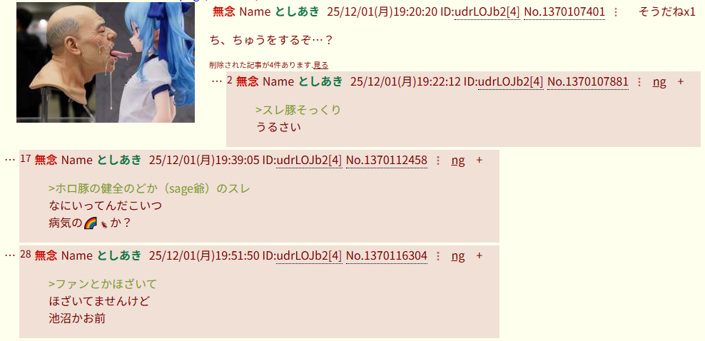 この画像を貼り始めた2025年下半期にはホ□ライブにも不祥事やアクシデントが多発。sage爺のような人間がファン面しているだけでも迷惑な話であるが、疫病神そのもののようなsage爺にまとわりつかれて、その上この呪詛である。人の迷惑を顧みないsage爺は人間のクズ。