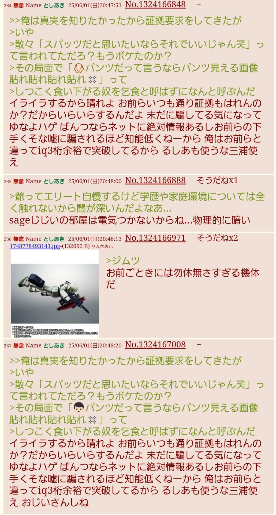 ちょっとした共通点で話題を振られたと思い込む、気持ち悪いオタクの駄目なところを煮詰め、女が腐ったようなとも評されるsage爺の構ってムーブには顰蹙が殺到。sage爺の対人エアプがまた浮き彫りとなったのだった。