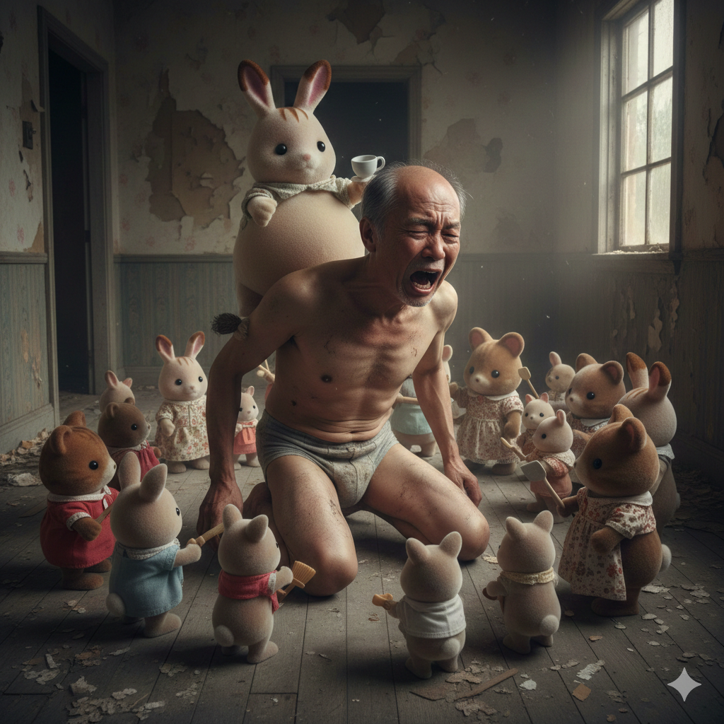 【画像:AI製シルバニアファミリーに怯える老人。】