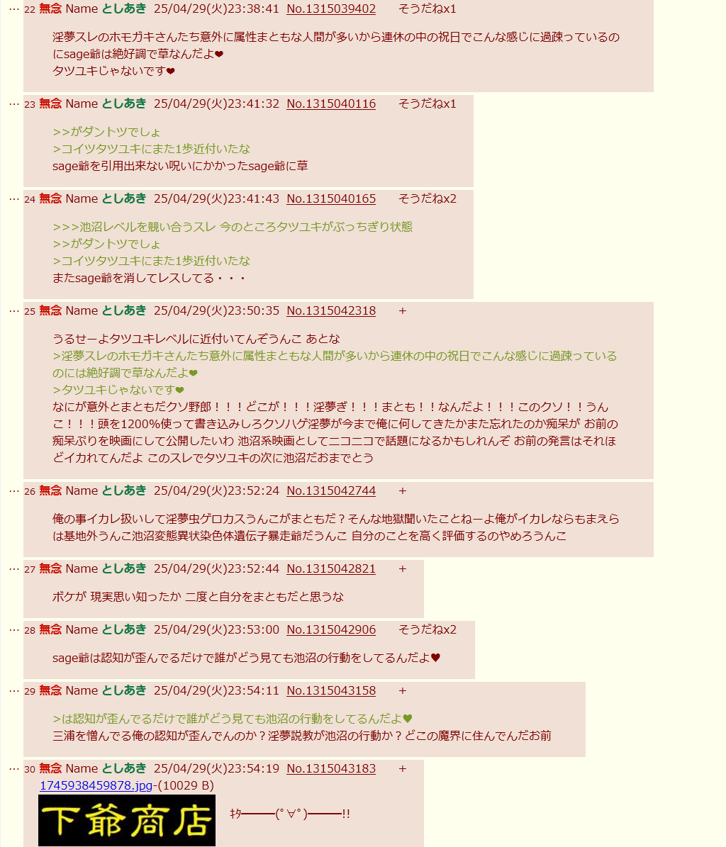 しかし気に食わないと思ってはいるようで、タツユキが貼った食事の写真の書き込みを改ざんし、淫夢厨やタツユキが貧乏メシを食っているような印象操作を細々と続けている。