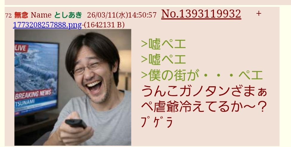 【画像:3月11日に震災被災者を嘲笑するsage爺。人間社会で暮らせないのも納得の人間性。】