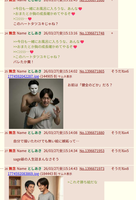 【画像:sage爺にすら使えてしまう生成AIが他のとしあきに使えない筈もない。sage爺が苦手とするおフェラ座の怪人との絡みも作成されてしまう。】