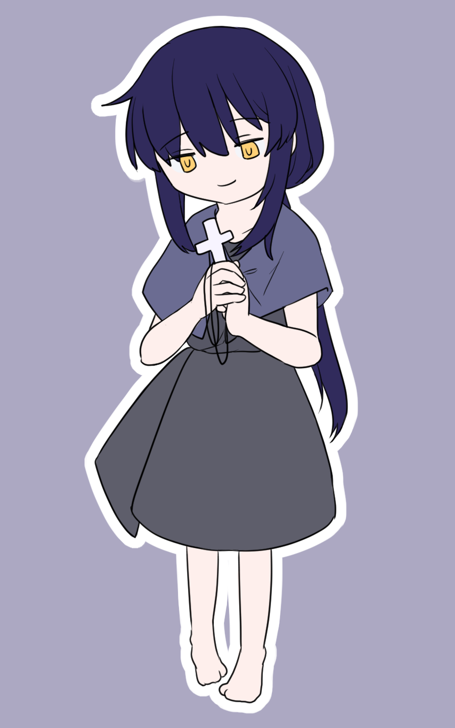 紺の髪に金の瞳。羽織っている上着とロザリオぽいものはラクシーにあげた。