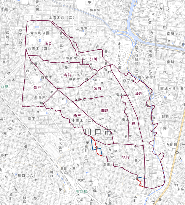 間野(まの):川口税務署のあたり。1937年に青木町一~四丁目になった。