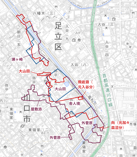 飛岩淵(元入谷分):飛地組替で入谷村から編入した。1924年に大字弥兵衛新田字舎人境に編入した。