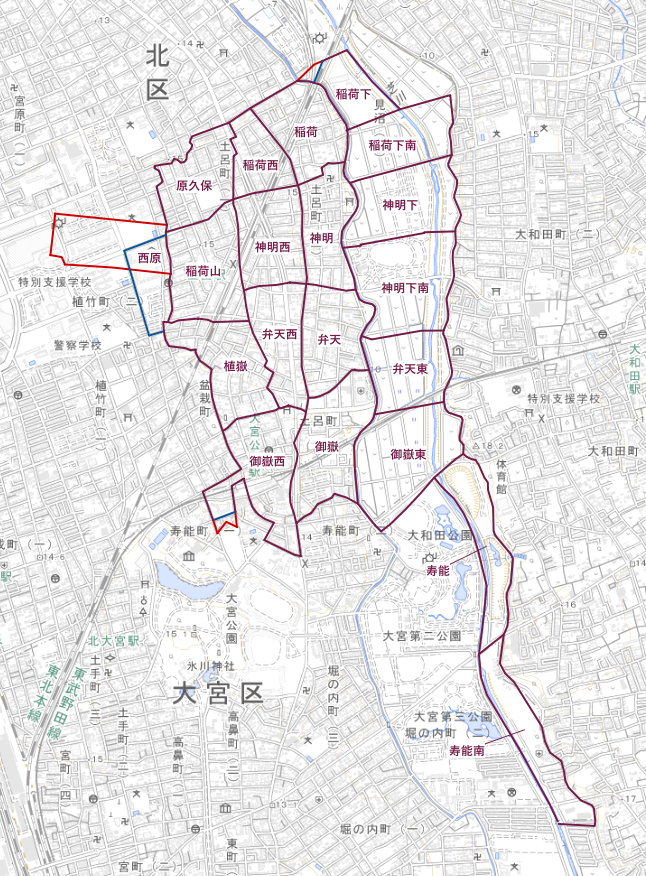 御嶽西(みたけにし):大宮公園駅のあたり。1956~1958年に寿能町一丁目、盆栽町、土呂町になった。