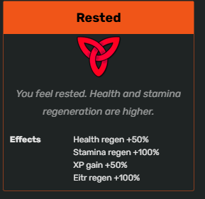 画面上のバフ説明には表示がありませんが、休息済みは経験値の取得を1.5倍にします。