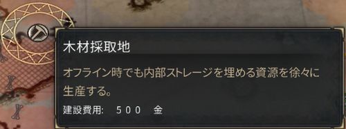 Lv1 木材+20/時 倉庫820 Lv2 木材+30/時 倉庫1440 Lv3 木材+70/時 糧食-1/時 倉庫3920 Lv4 |