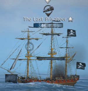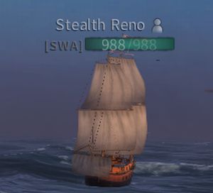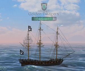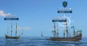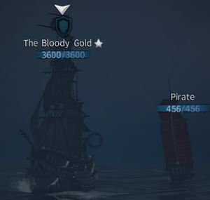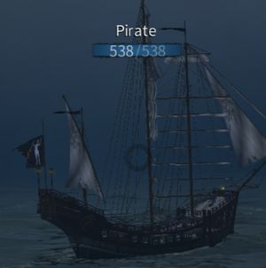 海賊船団 青HP+複数船+先頭船に盾のマーク ※襲ってこない、攻撃すると連鎖反応 ※取引不可、武器をドロップ ぶつかる |