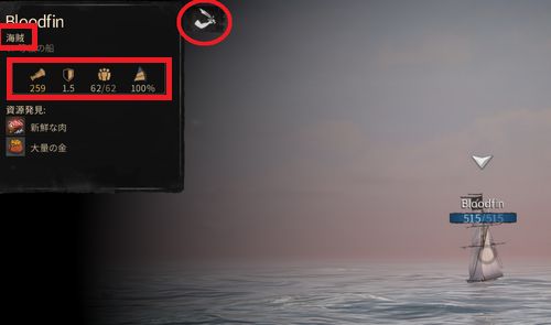 アクティブ海賊 青HP+船の上に望遠鏡のアイコン ※近づくと襲ってくる ぶつかる |